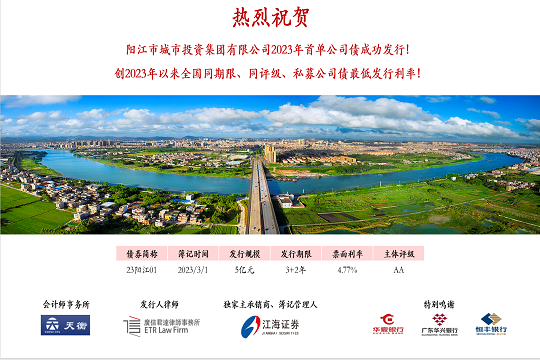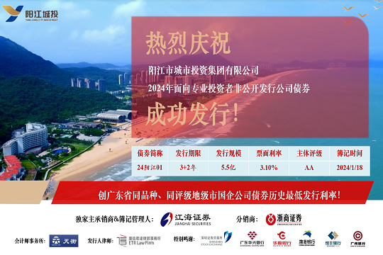 2024年1月19日,市城投集團在深圳證券交易所成功發(fā)行“陽江市城市投資集團有限公司2024年面向專業(yè)投資者非公開發(fā)行公司債券”。本期債券發(fā)行規(guī)模為5.5億元,期限為5(3+2)年,票面利率3.10%,全場認購倍數超過4.8倍,是...
