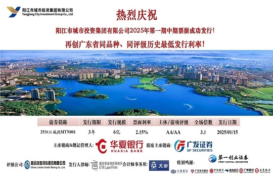 2025年1月15日,市城投集團在中國銀行間交易商協(xié)會成功發(fā)行“陽江市城市投資集團有限公司2025年第一期中期票據”。本期債券發(fā)行規(guī)模為6億元,期限為3年,票面利率2.15%,全場倍數超過3.1倍,合計申購機構數23家。本期債...